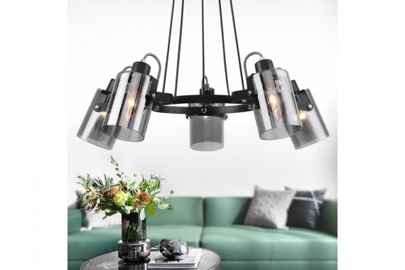 Люстра Rivoli Davida 5099-305 5 х Е14 40 Вт лофт - кантри Rivoli Davida - итальянская коллекция современных люстр из металла и стекла. Такие люстры помогут создать эффектный интерьер в стиле лофт, кантри. Данная модель (арт. 5099-305) имеет 5 стеклянных плафонов под лампы Е14 40 Вт. Высота подвеса люстры на потолок Davida регулируется. Арматура люстры Rivoli Davida окрашена в черный цвет гальваническим методом, корпус не выцветет со временем, на нем не возникнут царапины и сколы. Люстры Davida выбирают в качестве основного светильника в спальню или на кухню. Люстра подвесная на тросах Rivoli Davida входит в единую коллекцию с подвесной люстрой на 7 ламп (5099-307) и бра (5099-401). Посмотрите фото этих моделей, чтобы купить хорошие бра и люстры в спальню, гостиную, прихожую, на кухню.