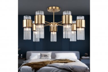 Люстра Rivoli Donna 3149-307 7 х Е14 40 Вт модерн Люстра потолочная на металлической штанге Rivoli Deborah (арт. 3149-307) – современная золотая люстра в стиле модерн для оформления трендовых интерьеров. Плафоны люстры состоят из прозрачных стеклянных трубочек, прекрасно пропускающих свет. Форма плафонов люстры – цилиндр, количество плафонов – 7. Металлический корпус люстры окрашен гальваническим способом в красивый цвет французское золото, который прекрасно смотрится как в современных, так и в классических пространствах. Освещаемая площадь данной люстры в гостиную – до 21 м2. В коллекции Rivoli Deborah также люстра под 5 ламп - арт. 3149-305, светильник подвесной - арт. 3149-201, светильник настенный - арт. 3149-401. Итальянский бренд Rivoli выпускает коллекцию аналогичного дизайна в цвете хром - Rivoli Deborah: арт. 3148-401, 3148-305, 3148-307, 3148-201.