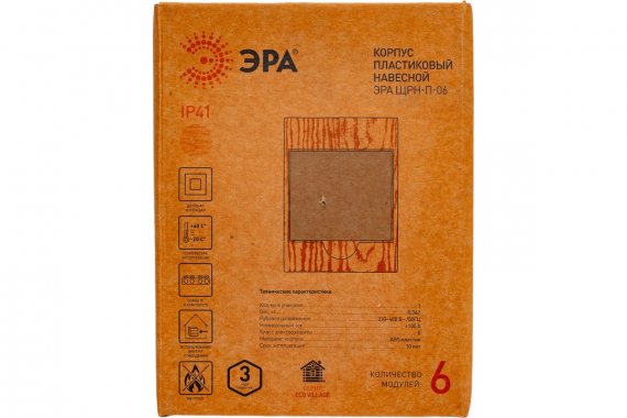 Корпус пластиковый ЩРН-П-06 ЭРА BOXF 06_P IP41 сосна Щит распределительный навесной ЭРА ЩРН-П-06 в цвете сосна, с тонированной дверцей. Бокс рассчитан на 6 модулей. Пластиковый распределительный корпус специальной серии ЭРА ECO VILLAGE - идеальный вариант щитков для загородного жилья и объектов деревянного строительства. Эстетично вписываются в интерьер загородных домов, дач, шале. Защита от влаги и пыли - IP41. Тип установки - навесной. Щит изготовлен из ABS-пластика, устойчивого к воздействию ультрафиолета. Успешно эксплуатируется при температурах от -20 до +40 градусов. Боксы ЭРА ECO VILLAGE устанавливаются внутри жилых помещений, под навесом. В комплект входит набор для монтажа, шина N, шина PE, маркировочная лента.