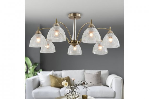 Люстра Rivoli Doreen 2079-307 7 х Е27 60 Вт классика Подвесные люстры Rivoli Doreen олицетворяют собой современный взгляд на классику. Металлический корпус с простыми четкими линиями рожков имеет стойкое покрытие оттенка античная бронза. Плафоны из прозрачного стекла декорированы узором. Основание этой большой 7-рожковой люстры украшено стеклянным элементом, придающим данной люстре на потолок оригинальность и солидность. Современные люстры Doreen от итальянского бренда Rivoli гармонично сочетают в себе традиционную элегантность и актуальный минимализм. За счет этого они идеально подойдут для самых разных пространств: от классических до лофт-интерьеров. Люстра с эргономичным круговым расположением ламп - беспроигрышное решение для гостиной, столовой, кухни, спальни, квартиры-студии, загородного дома. К Rivoli Doreen подходят лампы самого популярного цоколя - Е27. Мощность каждого источника света - 60 Вт. Данные подвесные люстры ярко и качественно освещают большие комнаты площадью 21 м?. Для экономии электроэнергии применяйте светодиодные лампы. Серия Rivoli Doreen - это люстры с 5 лампами (арт. 2079-305), с 7 лампами (арт. 2079-307) и бра (арт. 2079-401).