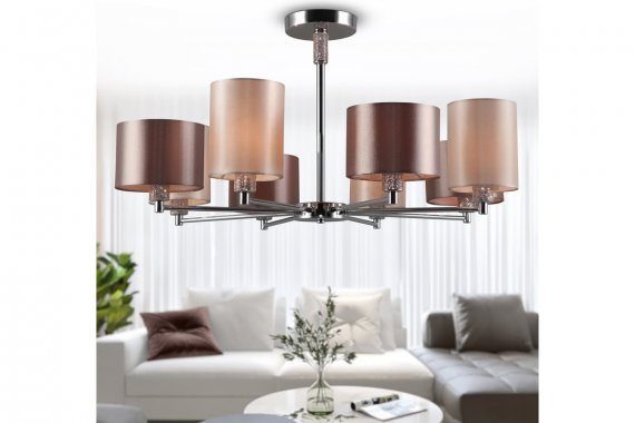 Люстра Rivoli Ebony 2081-308 8 х Е14 40 Вт классика Большая люстра в спокойной классической стилистике под 8 ламп Е14 40 Вт. Люстры на штанге – актуальный тренд дизайна интерьеров. Лаконичная хромированная арматура потолочной люстры Ebony от итальянского бренда Rivoli инкрустирована декоративными кристаллами. Оригинальность люстре потолочной придают плафоны с чередованием светло-серого и серого цветов. Плафоны разной высоты выполнены в формате абажуров, перетянутых тканью. Специальная ткань устойчива к загрязнениям, высоким температурам, механическим воздействиям. В дизайнерскую коллекцию Rivoli Ebony входят: люстра под 8 ламп (арт. 2081-308), люстра под 6 ламп (арт. 2081-306), бра (арт. 2081-401), настольная лампа (арт. 7081-501).