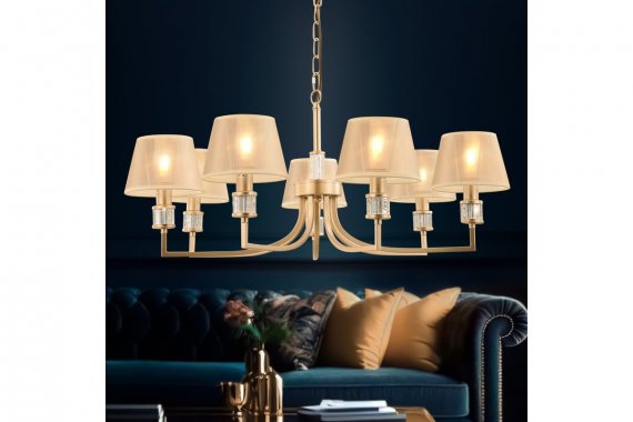 Люстра Rivoli Elinor 2083-307 7 х Е14 40 Вт классика Классические потолочные люстры Rivoli Elinor (арт. 2083-307) с оригинальными деталями и регулировкой высоты подвеса. Полупрозрачные плафоны кремового цвета изготовлены из прочной интерьерной ткани, которая не выцветет со временем. Эти люстры подвесные - прекрасная покупка, которая продемонстрирует ваш замечательный вкус и будет радовать долгие годы. Арматура потолочной подвесной люстры от итальянского бренда Rivoli окрашена в красивый цвет французское золото и декорирована вставками из прозрачного стекла. Люстра Elinor идеально смотрится на любом потолке, в том числе натяжном. Подходящие лампы для люстры в спальню или гостиную Elinor - Е14 40 Вт. Данная модель рассчитана на 7 источников света. Коллекция дополнена подвесной люстрой на 5 ламп (арт. 2083-305), подвесным абажурным светильником на 5 ламп (арт. 2083-310), настольным светильником (арт. 7083-501) и настенным бра (арт. 2083-401).
