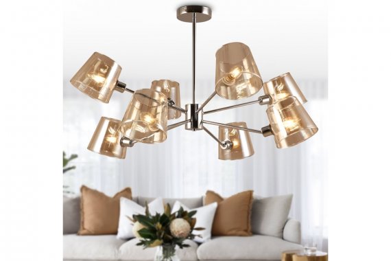 Люстра Rivoli Eliza 2084-308 8 х Е14 40 Вт классика Люстра потолочная на металлической штанге Eliza от итальянского бренда Rivoli имеет 8 стеклянных тонированных плафонов под лампы Е14 40 Вт. 8-рожковая люстра классическая на протолок (арт. 2084-308) входит в коллекцию Eliza, которую дополняют потолочные люстры на штанге под 6 ламп (арт. 2084-306) и бра настенное (арт. 2084-401). Мягкая тонировка плафонов с тёплым карамельным оттенком делает освещение уютным и комфортным для глаз. Металлический корпус люстры предельно лаконичен, что соответствует стилю современная классика. Арматура люстры имеет стойкое гальваническое окрашивание оттенка хром. Хромированные люстры на штанге – модное и очень удачное решение для большинства современных пространств.