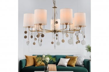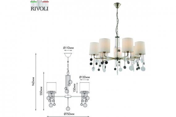 Люстра Rivoli Ellie 2085-307 7 х Е14 40 Вт классика Rivoli Ellie - большая 7-рожковая люстра в стиле современная классика. Люстры Ellie от итальянского бренда Rivoli декорированы круглыми стеклянными подвесками, закреплёнными на разной высоте на тонкие цепочки. Корпус люстры изготовлен из лёгкого прочного металла, лампы «смотрят» вверх. Источники света, применяемые с люстрами Ellie Rivoli – Е14 40 Вт. В дизайнерской коллекции Ellie люстры потолочные с 5 плафонами (арт. 2085-305), люстры потолочные с 7 плафонами (арт. 2085-307), бра настенное (арт. 2085-401). Плафоны люстры в количестве 7 шт обтянуты специальной абажурной тканью, не скапливающей пыль и отталкивающей влагу. Металлический корпус имеет стойкое гальваническое окрашивание цвета античная бронза.