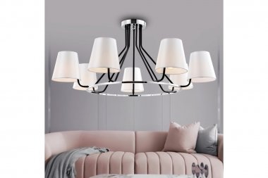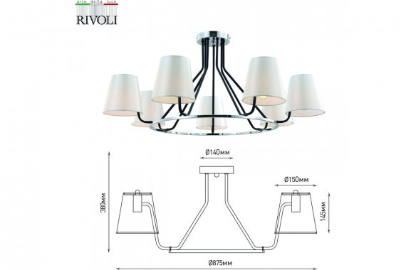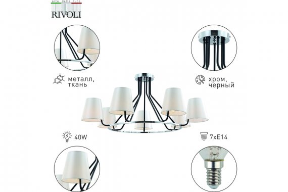 Люстра Rivoli Florence 2086-307 7 х Е14 40 Вт классика Люстра с 7 тканевыми плафонами красивого белого цвета с жемчужным оттенком. В коллекцию итальянского бренда Rivoli Florence входят люстры потолочные под 5 и 7 ламп (артикулы 2086-305, 2086-307) и светильник настенный (арт. 2086-401). Лаконичный корпус классической люстры с элементами замкового стиля окрашен в цвета чёрный и хром. 7 плафонов расположены по кругу, что обеспечивает равномерность общего освещения, создаваемого этой большой люстрой. Rivoli Florence 7-рожковая подойдёт в качестве люстры в гостиную, люстры в загородный дом, люстры в спальню. Такая люстра на потолок отлично освещает просторные жилые комнаты, создавая в них уют.