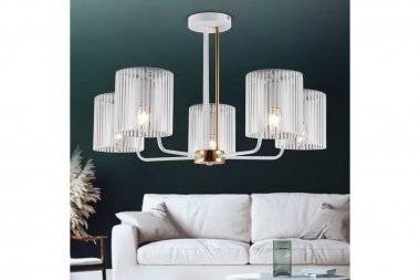 Люстра Rivoli Evonne 2088-305 5 х Е14 40 Вт классика 5-рожковая люстра на двух штангах – белого и золотого цветов. Плафоны люстры на потолок Rivoli Evonne (арт. 2088-305) изготовлены из стекла с чередованием прозрачных и матовых участков. Дизайнерскую коллекцию Evonne в классическом стиле дополняют люстры 7-рожковые (арт. 2088-307) и настенное бра (арт. 2088-401). Люстра Evonne c 5 стеклянными плафонами качественно освещает до 15 м2 площади жилого пространства. Эту модель стоит купить в качестве основной люстры в гостиную, люстры в спальню. Такая дизайнерская люстра даст много света и поможет создать неповторимый интерьер. Источники света для данной люстры – Е14 40 Вт (5 ламп).