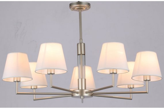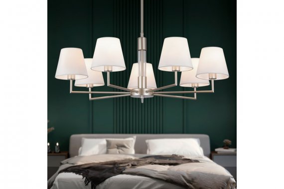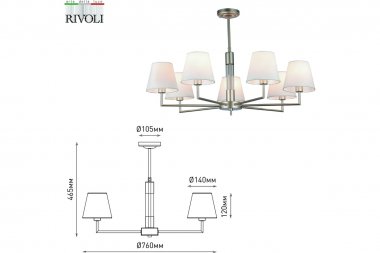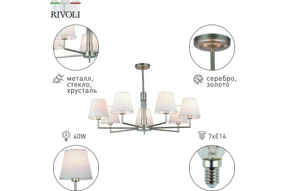 Люстра Rivoli Freda 2089-307 7 х Е14 40 Вт классика Люстра потолочная классическая с качественным ровным светом, количество плафонов – 7, освещаемая площадь – до 21 м2. Rivoli Freda – коллекция в классическом стиле, в которую входят люстры под 5 и 7 ламп (арт. 2089-305 и 2089-307), настенное бра под 1 лампу (арт. 2089-401). Металлические рожки коллекции имеют чёткие линии, плафоны-абажуры обтянуты тканью матового белого цвета. Цвет арматуры – серебристый. Стойкое гальваническое покрытие сохраняет красоту оттенка на долгие годы. Люстра Freda итальянского дизайна отлично впишется как в традиционные, так и в современные пространства. Большая 7-рожковая люстра – прекрасное решение для гостиных, загородных домов, ресторанов, гостиниц. Основание люстры имеет прозрачную декоративную колбу, что является дополнительной дизайнерской «фишкой».