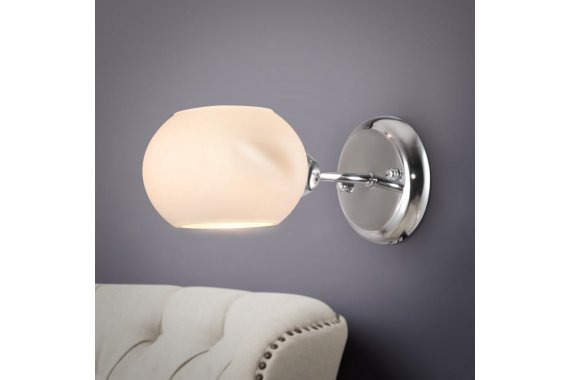 Бра светильник Rivoli Doris 2080-401 настенный 1 х Е14 40 Вт модерн Rivoli Doris – дизайнерская коллекция люстр и бра с хромированной арматурой и фигурными округлыми плафонами из матового стекла. В коллекцию входят: бра настенное под 1 лампу (арт. 2080-401), люстра потолочная на штанге с 5 плафонами (арт. 2080-305), люстра потолочная на штанге с 7 плафонами (арт. 2080-307). Светильник-бра настенный Rivoli Doris под лампу Е14 40 Вт освещает площадь до 3 м2. Такие настенные светильники применяются как прикроватные бра, бра над тумбочками у кровати, бра в прихожую, бра в кабинет, бра на кухню, бра в гостиную. Аккуратный дизайн обеспечивает универсальность применения данных бра. Матовое стекло бра устраняет блики, делая свет комфортным для глаз.