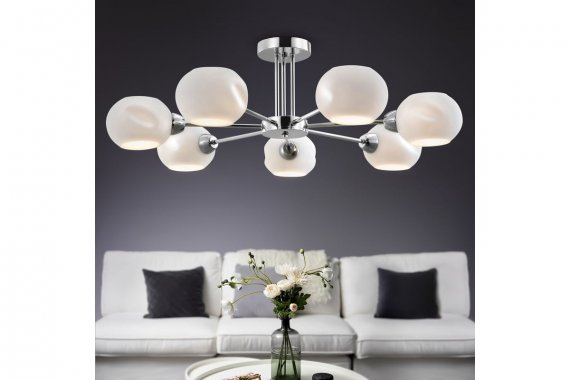 Люстра Rivoli Doris 2080-307 7 х Е14 40 Вт модерн Люстра потолочная на штанге с 7 плафонами, расположенными по кругу на одинаковом расстоянии друг от друга. Матовые стеклянные плафоны смягчают яркость света, делая его комфортным для глаз. Люстра на потолок Rivoli Doris создаёт равномерное освещение. Освещаемая площадь люстры – до 21 м2. Отличный вариант люстры в современную квартиру, люстры в загородный дом. Rivoli Doris в стиле модерн – дизайнерская коллекция люстр и бра с хромированной арматурой и фигурными округлыми плафонами из матового стекла. В коллекцию входят: бра настенное под 1 лампу (арт. 2080-401), люстра потолочная на штанге с 5 плафонами (арт. 2080-305), люстра потолочная на штанге с 7 плафонами (арт. 2080-307).