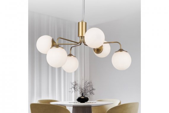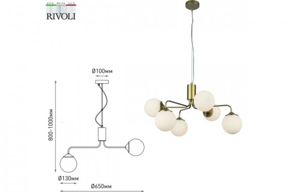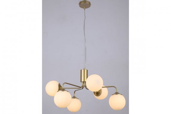 Люстра Rivoli Felicity 3150-306 6 х Е27 40 Вт модерн Rivoli Felicity – коллекция дизайнерских люстр для современных интерьеров. Корпус люстр потолочных подвесных Felicity изготовлен из лёгкого прочного металла, окрашенного гальваническим способом в цвет латуни. Круглые матовые плафоны расположены «хаотично», рожки направлены в разные стороны, что соответствует самым актуальным трендам дизайна интерьеров – как квартир, так и гостиниц, ресторанов, офисов, общественных пространств. В коллекции Felicity от итальянского бренда Rivoli представлены люстры подвесные под 6 ламп (арт. 3150-306) и люстры подвесные под 8 ламп (арт. 3150-308). Высоту подвеса можно выбрать при монтаже. Данная люстра подвесная с 6 плафонами создаёт качественное освещение и особое настроение на площади до 18 м2.