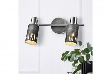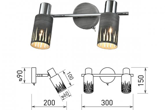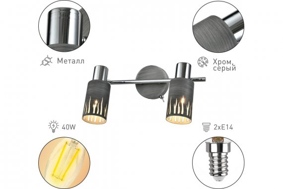 Светильник настенно-потолочный спот Rivoli Lethe 3123-312 2 х Е14 40 Вт поворотный модерн с выключателем Rivoli Lethe с 2 металлическими плафонами (арт. 3123-312) - светильники настенные с выключателем на корпусе и возможностью регулировки направления света. Источники света для данных бра на стену - Е14 40 Вт. На поворотных плафонах бра есть перфорация в природных мотивах. Цвет спота накладного Lethe - серый с хромированными деталями. Перфорированные плафоны из металла объединяет лаконичная металлическая рейка. Миниатюрный выключатель расположен на корпусе светильника настенного. Включать и выключать бра над кроватью, бра в спальне, бра на стене кухни Rivoli Lethe очень удобно. Дизайн накладного спота Lethe создан итальянским брендом Rivoli. Перфорация в экостиле украшает плафоны и создает световую игру при включенных лампах. Споты настенные Lethe Rivoli освещают площадь 6 м2. Коллекция Rivoli Lethe включает настенно-потолочные светильники для интерьеров в стиле лофт, ретро, кантри, модерн. Артикулы для поиска других бра коллекции и подвесного светильника - 3123-401, 3123-303, 3123-201.