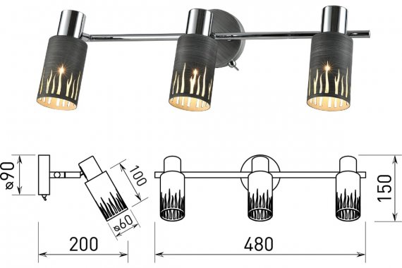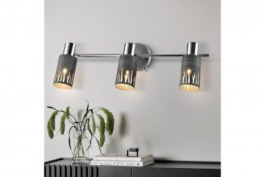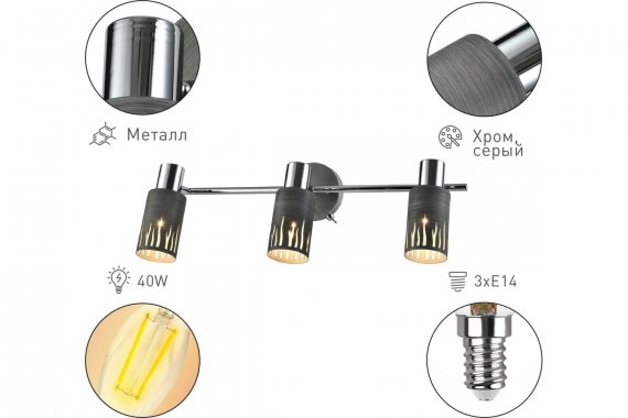 Светильник настенно-потолочный спот Rivoli Lethe 3123-303 3 х Е14 40 Вт поворотный модерн с выключателем Rivoli Lethe с 3 серыми металлическими плафонами на минималистичной хромированной рейке (арт. 3123-303) - бра настенное с выключателем и поворотным механизмом для регулировки направления световых потоков. Настенные светильники Lethe Rivoli идеальны для зонирования пространства, организации дополнительной подсветки, в качестве бра над кроватью, бра в гостиной, бра у стола. Площадь освещения спота накладного Lethe - 9 м2. Для данного бра с выключателем рекомендованы лампы Е14 40 Вт. Эффектная особенность дизайна, выгодно отличающая настенные светильники Rivoli Lethe - перфорация металлических плафонов. Перфорированный узор в экостилистике создает декоративный эффект через игру света. При выключенном освещении декоративные отверстия также привлекают внимание и дополняют интерьер. В коллекции Lethe итальянского бренда Rivoli представлены также настенно-потолочные светильники 3123-401, 3123-312, 3123-201. Дизайнерские светильники Lethe удачны для стилей лофт, ретро, модерн, кантри.