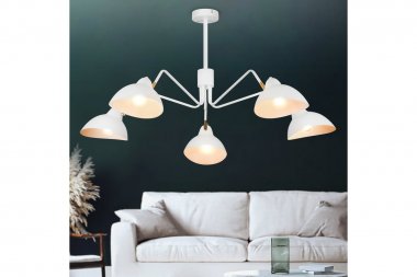 Люстра Rivoli Georgia 4100-305 5 х Е14 40 Вт дизайн Rivoli Georgia (арт. 4100-305) - металлическая люстра формата паук с козырьковыми плафонами под уличные ретро-фонари. Белая минималистичная люстра из металла прекрасно дополнит интерьеры с стиле лофт, лофт-кантри, в скандинавском стиле. Свет 5 плафонов люстры направлен вниз, что помогает организовать в комнате яркое основное освещение. Лампы для люстры потолочной на штанге Rivoli Georgia – Е14 40 Вт, приобретаются отдельно. Из ассортимента итальянского бренда Rivoli можно купить аналогичную люстру в чёрном цвете – арт. 4101-305. Дизайнерскую коллекцию Rivoli Georgia дополняют люстры под 7 ламп (арт. 4100-307) и бра (арт. 4100-401).
