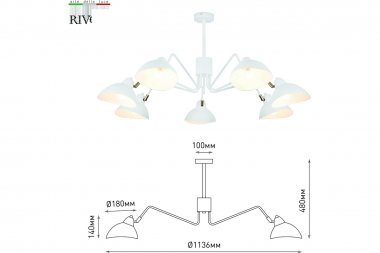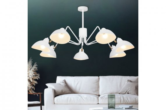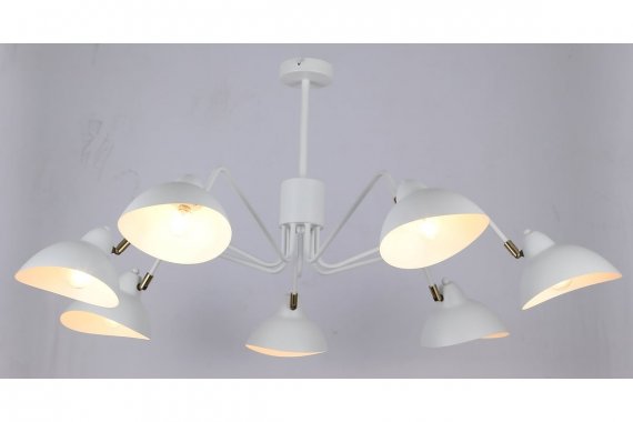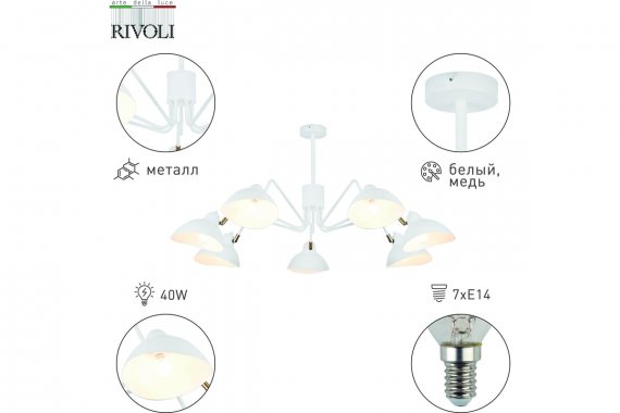 Люстра Rivoli Georgia 4100-307 7 х Е14 40 Вт дизайн Металлическая люстра потолочная Rivoli Georgia (арт. 4100-307) с 7 плафонами, дизайн которых напоминает уличные ретро-фонари. Люстра-паук на штанге прекрасно дополнит любой современный интерьер. Потолочная люстра Georgia изготовлена из лёгкого прочного металла и имеет стойкое гальваническое покрытие, защищающее люстру от выцветания и царапин. Белый цвет делает люстры Georgia универсальными для любого пространства. Купить аналогичную люстру в чёрном цвете можно по артикулу 4101-307 (Rivoli Geraldine). В коллекции белых металлических люстр и светильников Rivoli Georgia вы найдёте также люстры под 5 ламп (арт. 4100-305), бра – арт. 4100-401. Свет плафонов с фонарными козырьками направлен вниз, что формирует яркий направленный световой поток. Коллекция декорирована латунными деталями у основания плафонов.