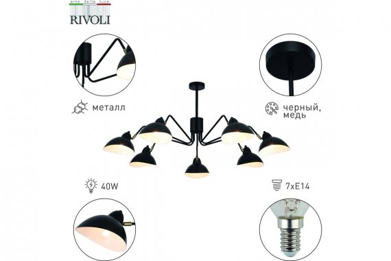 Люстра Rivoli Geraldine 4101-307 7 х Е14 40 Вт дизайн Дизайнерская люстра потолочная металлическая Rivoli Geraldine (арт. 4101-307) с 7 плафонами, дизайн которых напоминает уличные ретро-фонари. Люстра-паук на штанге прекрасно дополнит любой современный интерьер. Потолочная люстра Geraldine изготовлена из лёгкого прочного металла и имеет стойкое гальваническое покрытие, защищающее люстру от выцветания и царапин. Чёрный цвет делает люстры Geraldine удачным акцентным решением для оформления пространства. Купить аналогичную люстру в белом цвете можно по артикулу 4100-307 (Rivoli Georgia). В коллекции чёрных металлических люстр и светильников Rivoli Geraldine вы найдёте также люстры под 5 ламп (арт. 4101-305), бра – арт. 4101-401. Свет плафонов с фонарными козырьками направлен вниз, что формирует яркий направленный световой поток. Коллекция декорирована латунными деталями у основания плафонов.