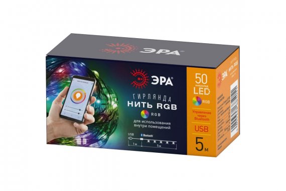 Гирлянда ЭРА Нить с пультом, RGB, 5 м, 220 В, с таймером, с музыкой, с упр. через моб. Б0055994 предназначена для создания декоративной и праздничной иллюминации.