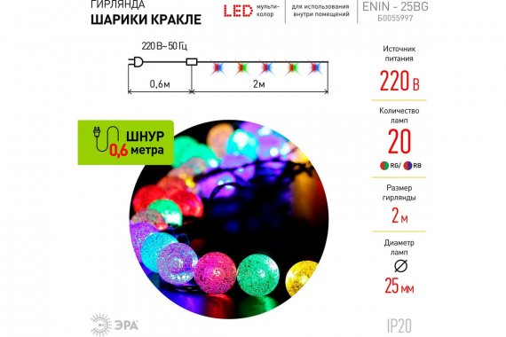 Технические характеристики ЭРА LED Нить Шарики ENIN - 25BG 20LED, нить, шарики, диаметр 25 мм, 2 м, RGB Б0055997