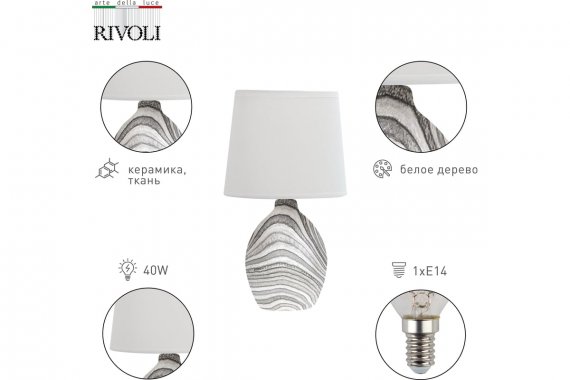 Настольная лампа Rivoli Chimera 7072-502 1 * Е14 40 Вт керамика белое дерево Настольные лампы Rivoli Chimera составляют коллекцию: арт. 7072-501 – керамическая лампа настольная с основанием под мрамор, арт. 7072-502 – настольная лампа с керамическим основанием под белое дерево, арт. 7072-503 – настольная лампа в дизайне под светлое дерево. Настольные светильники Chimera от итальянского бренда Rivoli имеют абажур из плотной грязеотталкивающей ткани белого цвета. Подключение к сети через провод с кнопочным выключателем. Светильники настольные Chimera применяются с лампочкой Е14 40 Вт. Данный ночник настольный выполнен в светлых цветах и подойдёт в любой интерьер. Особо удачное решение - купить этот дизайнерский настольный светильник в гостиную, спальню или кабинет классического стиля.