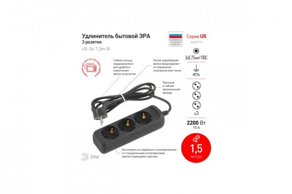 Удлинитель электрический ЭРА UX-3e-1,5m-B с заземлением 3 розетки 1,5 м ПВС 3x0,75мм2 10А черный Удлинитель электрический Эра UX-3e-1,5m-B с заземлением, черный, 3 розетки. Провод ПВС, 3x0,75мм2, 1,5 м. Рассчитан на максимальную мощность 10А/2200 Вт. Удлинитель Эра станет Вашим надежным помощником, если Ваши любимые электроприборы находятся далеко от розеток. Провод в удлинителях Эра сделан из 100% меди, что делает его абсолютно пожаробезопасным. Корпус выполнен из ударопрочного и негорючего пластика (полипропилен). Вилка обеспечена кольцом для удобного извлечения ее из розетки. Модель удлинителя на 10А позволяет подключить бытовые приборы общей нагрузкой до 2200 Вт. Дизайн удлинителя разработан в России командой Эра Style.