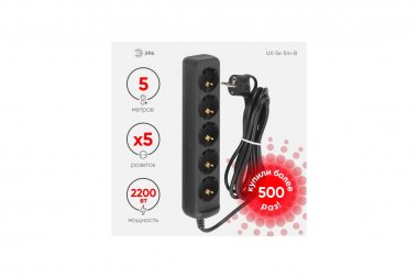 Удлинитель электрический ЭРА UX-5e-5m-B с заземлением 5 розеток 5 м ПВС 3х0,75мм2 10А черный Удлинитель электрический Эра UX-5e-5m-B с заземлением, черный, 5 розеток. Провод ПВС, 3x0,75мм2, 5 м. Рассчитан на максимальную мощность 10А/2200 Вт. Удлинитель Эра станет Вашим надежным помощником, если Ваши любимые электроприборы находятся далеко от розеток. Провод в удлинителях Эра сделан из 100% меди, что делает его абсолютно пожаробезопасным. Корпус выполнен из ударопрочного и негорючего пластика (полипропилен). Вилка обеспечена кольцом для удобного извлечения ее из розетки. Модель удлинителя на 10А позволяет подключить бытовые приборы общей нагрузкой до 2200Вт. Дизайн удлинителя разработан в России командой Эра Style.