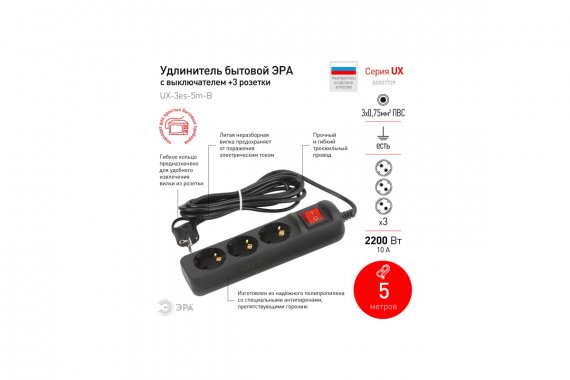 Удлинитель электрический ЭРА UX-3es-5m-B с заземлением с выключателем 3 розетки 5м ПВС 3x0,75мм2 10А черный Удлинитель электрический Эра UX-3es-5m-B с заземлением, с выключателем, черный, 5 розетки. Провод ПВС, 3x0,75мм2, 5м. Рассчитан на максимальную мощность 10А/2200 Вт. Удлинитель Эра станет Вашим надежным помощником, если Ваши любимые электроприборы находятся далеко от розеток. Провод в удлинителях Эра сделан из 100% меди, что делает его абсолютно пожаробезопасным. Корпус выполнен из ударопрочного и негорючего пластика (полипропилен). Вилка обеспечена кольцом для удобного извлечения ее из розетки. Модель удлинителя на 10А позволяет подключить бытовые приборы общей нагрузкой до 2200Вт. Дизайн удлинителя разработан в России командой Эра Style.