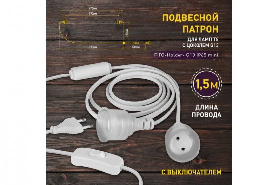 Патрон ЭРА FITO-Holder G13 IP65 mini для ламп FITO до 600 мм 2хG13 с выключателем, вилкой 1.5 м Патрон ЭРА FITO-Holder G13 IP65 mini для ламп Т8 FITO до 600 мм 2хG13 с выключателем и вилкой позволит без дополнительных усилий подключить лампу T8 и разместить ее в любом удобном для вас месте. Белый цвет удачно впишется в любой интерьер, а компактный размер не займет много места. Данное решение - это комплект герметичных патронов G13 для Т8 СВЕТОДИОДНОЙ лампы с выключателем и вилкой. Герметичные патроны для Т8 лампы ( G13) служат для обеспечения бесперебойной работы лампы в аквариуме, в подвале, на стелаже с рассадой. Герметичные патроны для Т8 лампы так же можно использовать для люминисцентных ламп, если до выключателя разместить между вилкой и выключателем ЭПРА подходящее под данную лампу. Светодиодная лампа имеет драйвер для работы лампы внутри лампы. Люминисцентная лампа имеет внешний драйвер, это необходимо учитывать при подключении светильника к сети. Патрон ЭРА FITO-Holder G13 IP65 с выключателем и вилкой для ламп Т8 (G13) представлен в двух вариациях: для ламп длиной до 600 мм (арт. 141309045), для ламп длиной до 1200 мм (арт. 141309047). Изделие позволит без дополнительных усилий подключить лампу T8 и разместить ее в любом удобном для вас месте. Белый цветудачно впишетсяв любой интерьер, а компактный размер не займет много места. Данное решение позволяет легко реализовать стелажи с рассадой, соблюсти все требования по электробезопасности. Сечение проводов достаточно для подвеса фито лампы на проводах.