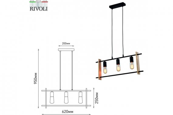 Светильник подвесной (подвес) Rivoli Elizabeth 5107-203 3 * Е27 40 Вт лофт - кантри потолочный квадратный Rivoli Elizabeth (арт. 5107-203) – подвесной светильник на тросах в каркасном корпусе прямоугольной формы. Подвесная люстра под 3 лампы Е27 40 Вт регулируется по высоте подвеса через укорачивание тросов при монтаже светильника подвесного на потолок. Каркасные подвесные светильники Rivoli Elizabeth созданы итальянскими дизайнерами специально для актуального стиля лофт-кантри. Корпус подвесной люстры с открытыми источниками света представляет собой совокупность чёрных металлических реек и «дощечек» светлого дерева. Корпус люстры целиком изготовлен из металла – лёгкого и прочного. Такие светильники потолочные подвесные прослужат десятилетия. Дизайнерскую коллекцию подвесных лофт-кантри люстр дополняют модели под 1 лампу (арт. 5107-201) и под 5 ламп (арт. 5107-305).