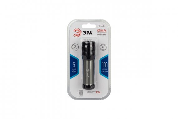 Светодиодный фонарь ЭРА UB-603 ручной на батарейках 3W ЭРА UB-603 – светодиодный ручной фонарь на батарейках. Работает в 3 режимах: максимальная яркость, 50% яркости, стробирование. Защищён от влаги и пыли – IP44. В фонаре установлен яркий светодиод последнего поколения. Мощность данного LED-фонаря – 3 Вт. Удобный ручной фонарик от торговой марки ЭРА создаёт луч дальностью до 100 метров. Регулировка светового луча позволяет использовать фонарь максимально удобно – создавать широкий заливающий свет или ярко подсвечивать конкретную область. Фонарь светодиодный ЭРА UB-603 отличается высоким для портативного фонаря световым потоком – 275 Лм. Источники питания – мизинчиковые батарейки (ААА), 3 шт.