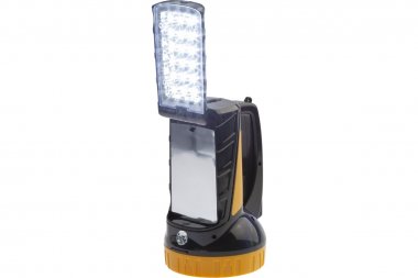 Светодиодный фонарь Трофи TSP19 прожекторный аккумуляторный со встроенным светильником Мощный фонарь прожектор от компании Трофи незаменимый вариант для работы, активного отдыха или ремонта. Одним из главных плюсов светодиодного фонаря является корпус из ударопрочного пластика. Он устойчив к падениям, тряске, неприхотлив в уходе. 37 светодиодов освещают пространство на максимальное расстояние в 100 м. Световой поток с нейтральным белым свечением равен 160 лм. Кемпинговый фонарь имеет встроенный аккумулятор, время непрерывной работы составляет 9 часов. Зарядное устройство входит в комплект. Уникальная особенность аккумуляторного фонаря встроенный в корпус светильник. Складная подвижная конструкция позволяет индивидуально настроить освещение. Данный фонарь мощностью 2,7 Вт удобно брать с собой. Он имеет эргономичную ручку, хорошо лежит в руке. В комплекте также предусмотрен ремешок, который можно закрепить на крючки в корпусе. Устройство всегда будет под рукой! Высокая степень защиты от пыли и влаги позволит использовать устройство в экстремальных условиях. Многофункциональный кемпинговый фонарь от бренда Трофи это высокое качество по оптимальной цене!