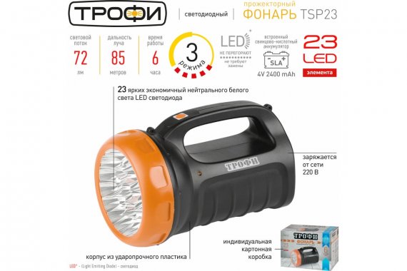 Светодиодный фонарь Трофи Профессиональные TSP23 прожекторный аккумуляторный 3 режима Аккумуляторный светодиодный фонарь: 23 белых LED (3 режима работы - 50%, 100%, мигание) Аккумулятор 4V 2,4Ah зарядка от 220V