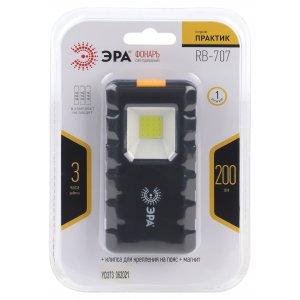 Светодиодный фонарь ЭРА RB-707 входит в рабочую серию «Практик». Это многофункциональные фонари со светодиодами «мультикристалл на плате» и множеством встроенных креплений на разные поверхности. Данный компактный фонарик оснащён магнитом и клипсой для подвешивания на пояс. Яркий помощник, который всегда под рукой! ЭРА «Практик» RB-707 работает от 3 мизинчиковых (ААА) батареек. Одного комплекта алкалиновых элементов питания хватает на 3 часа непрерывного свечения. Несмотря на свои компактные размеры, данный фонарь имеет хороший световой поток – 200 лм. Плата со светодиодами COB обеспечивает высокую яркость и равномерное распределение света. Корпус RB-707 покрыт мягким прорезиненным материалом софт-тач. Фонарь отличается современным лаконичным дизайном. Удобная кнопка включения контрастного цвета.