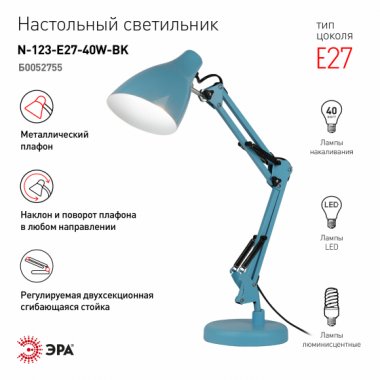 Настольный светильник ЭРА N-123-E27-40W-LBU Е27 с основанием голубой