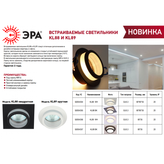 Эра Встраиваемый светильник алюминиевый ЭРА KL88 WH MR16/GU5.3 Б0054354