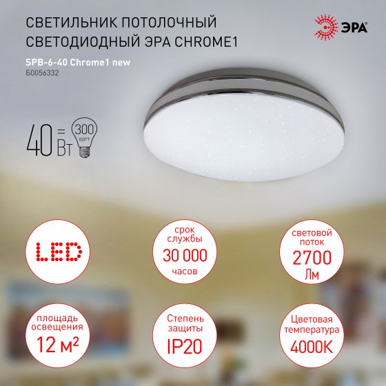Эра Светильник потолочный светодиодный ЭРА Классик без ДУ SPB-6-40 Chrome1 40 Вт 4000К Б0056332